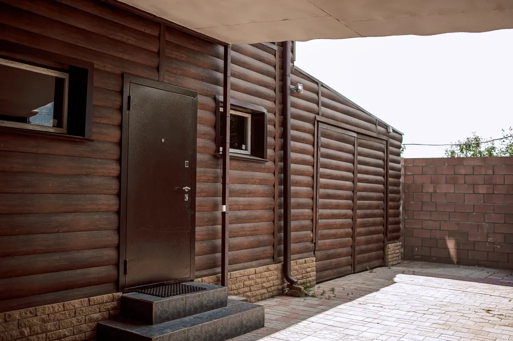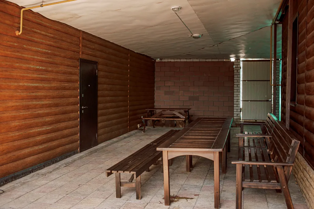 Большие вместительные деревянные столы. Гараж на 2 автомобиля длиною 10 метров, и возле двора достаточное количество парковочных мест.